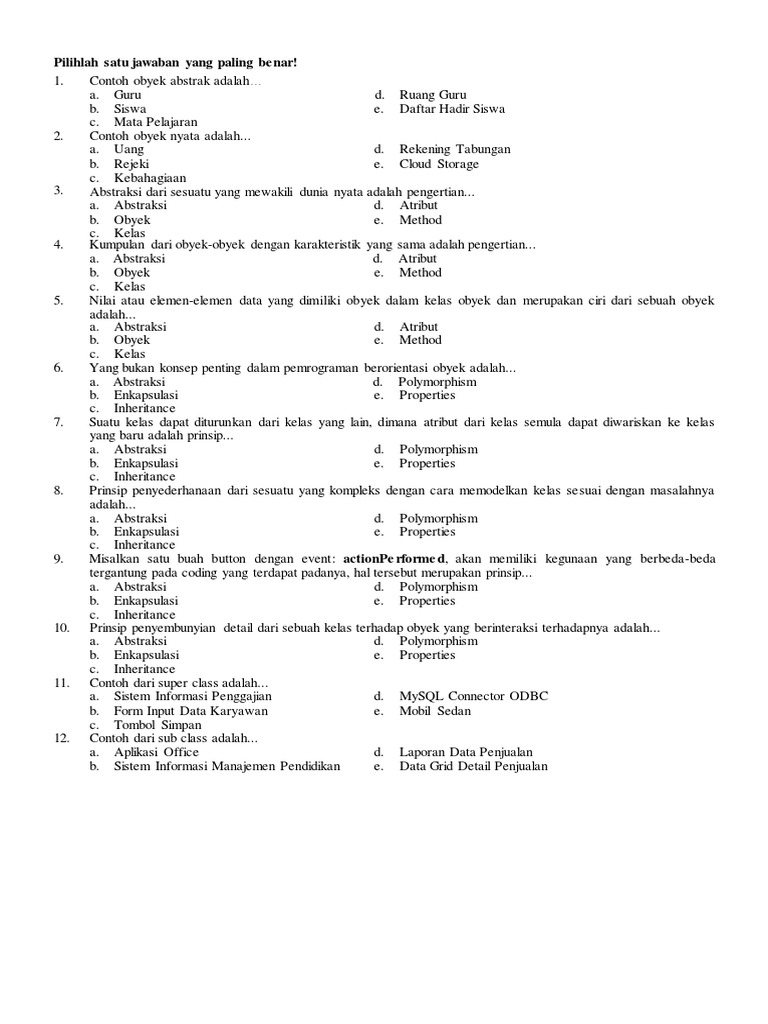 Soal Pbo Kelas 12 Beserta Jawabannya : Soal Uas Beserta Jawaban Pbo 1 Pemrograman Java Variabel Fungsi If Dan Methode Looping Jankrik / Adik adik yang baik hati, pada kesempatan yang bahagia ini kakak ingin membagikan beberapa contoh soal yang mungkin adik adik cari, soal kali ini kakak berikan adalah soal uts matematika untuk kelas 12 sma/ma, kebetulan kakak memberikan soal pilihan ganda saja.